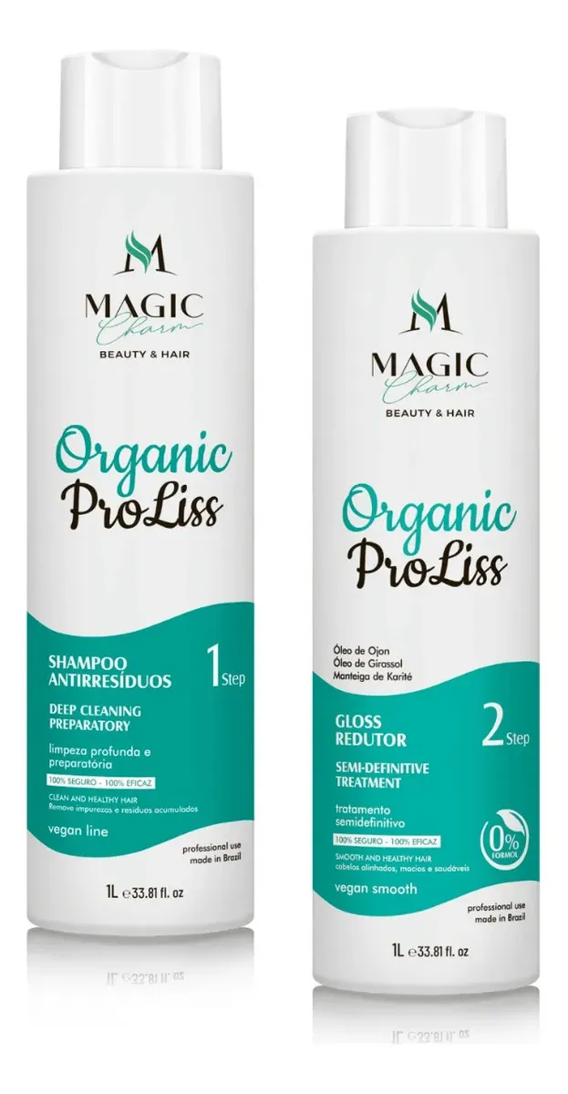 Magic Plus Escova Progressiva Zero Formol Organic contém uma fórmula inovadora na redução de volume e controle de frizz. Tratamento à base de Ácido proliss, hidrata, alinha os fios, deixando-os mais leves e soltos com aspecto natural. Indicado para todos os tipos de cabelo. Modo de Uso: 1 - Separe em mechas os cabelos limpos e secos; 2 - Com o auxílio de um pincel, aplique a escova progressiva Organic a 1 centímetro da raiz; 3 - Deixe agir de 20 a 50 minutos; 4 - Enxágue retirando totalmente o produto do cabelo; 5 - Seque 80% dos fios, escove e divida em 4 partes iguais; 6 - Pranche mechas finas de 5 a 15 vezes; 7 - Finalize como desejar; OBSERVAÇÃO IMPORTANTE: Para evitar alteração da cor em cabelos coloridos ou descoloridos, pranche no máximo até 5 vezes com temperatura máxima de 180°C. Precauções: Recomenda-se a aplicação do produto utilizando luvas. Em caso de contato com os olhos, lavá-los imediatamente com água em abundância. Manter em local fresco e fora do alcance de crianças. Livre de crueldade. Este produto é feito sem machucar nenhum animal. É vegano. Este produto é feito com elementos naturais de origem vegetal